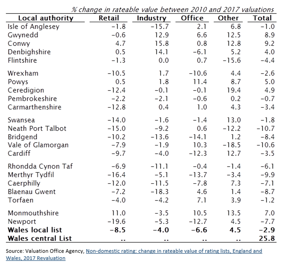 Percentage changes in rateable values between 2010 and 2017 valuations by local authority and sector – see table