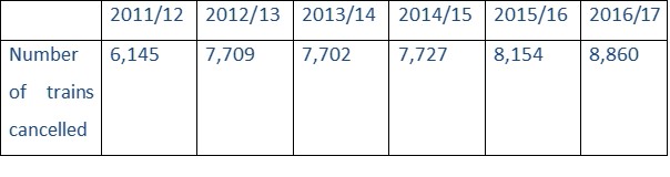 “Even more alarming is the fact that year on year, the number of trains cancelled is increasing, such as by 2,715 cancellations from 2011/12 to 2016/17.