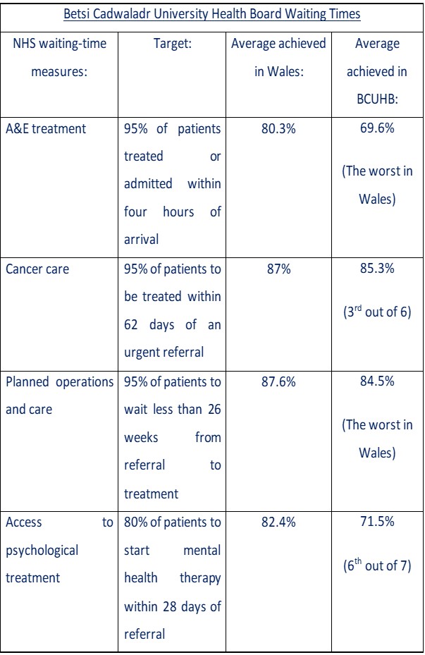 “Five of our seven health boards have missed every single waiting time target, with some of the worst failings being in Betsi Cadwaladr Unicersity Health Board.
