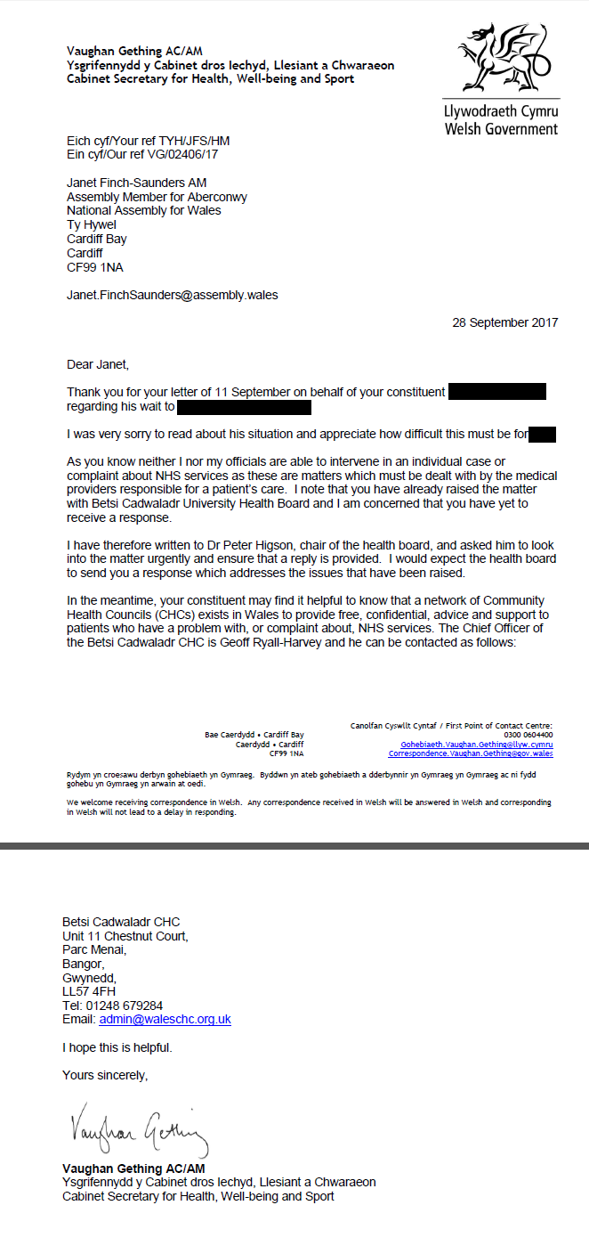 ‘In the meantime, your constituent may find it helpful to know that a network of Community Health Councils (CHCs) exists in Wales to provide free, confidential, advice and support to patients who have a problem with, or complaint about, NHS services’.